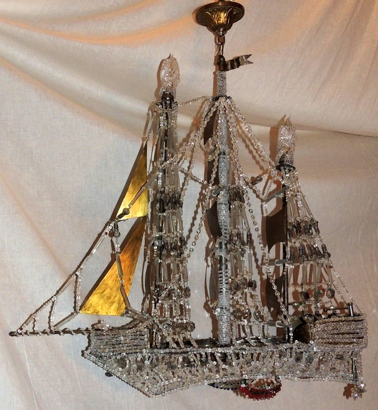 This chandelier, a ming dynasty junk ship design, was created in the early half of the 20th century and features crystal.