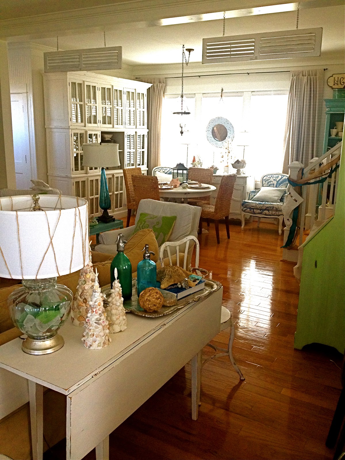 Beautiful coastal cottage decor with holiday wreaths hung on the doors is all you need to usher in the holiday spirit.
