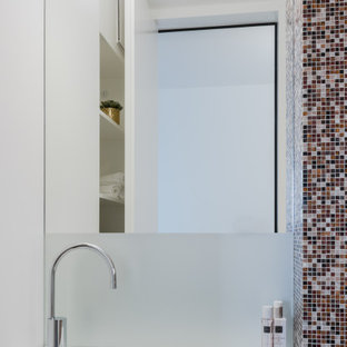 Powder room design ideas with glass tile and soapstone benchtops. The house is oiled bronze so i need to try to keep it in the family.